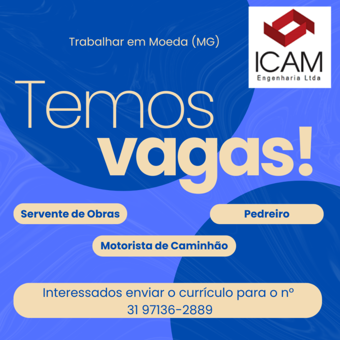 A empresa ICAM Engenharia Ltda está com novas oportunidades de trabalho abertas para atuação no município de Moeda (MG). As vagas disponíveis são para os cargos de servente de obras, pedreiro e motorista de caminhão.